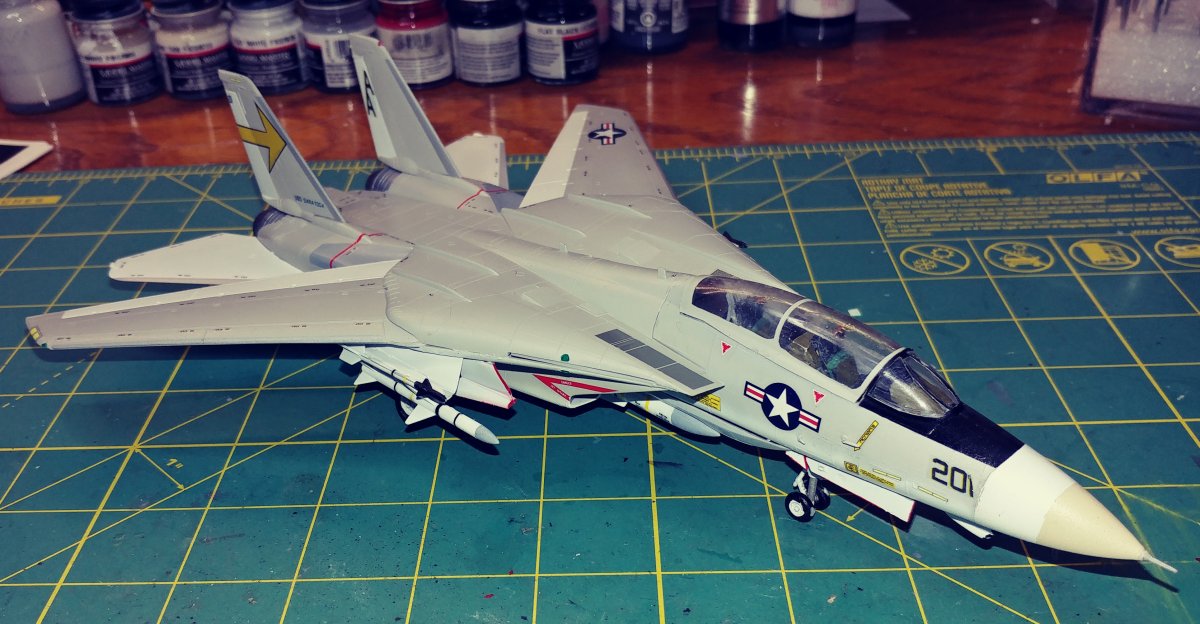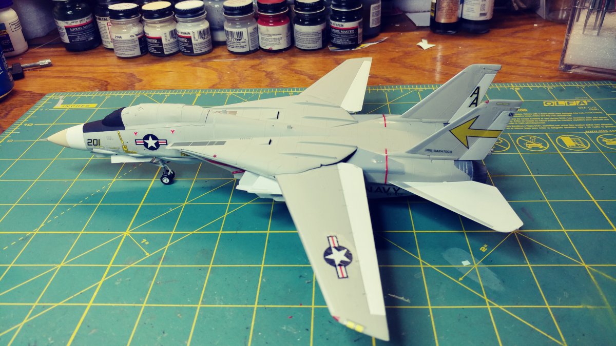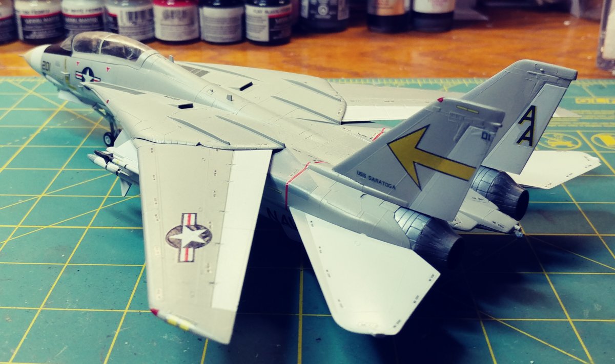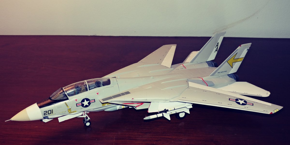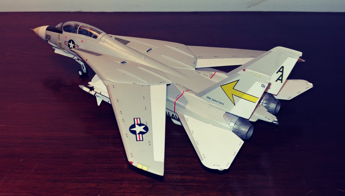 Upon opening the box, you find 6 sprues of gray plastic, a clear sprue with the canopy and decals for 2 aircraft. At first I was surprised to find raised panel lines rather than engraved until I saw the age of the kit and remembered raised panels were the norm for kits of this scale back in the 70's . Wheel well detail was minimal and and cockpit detail was non-existent requiring decals, Again indicative of the age of the kit. There was a small amount of flash on a couple of parts, but aside from that they were very clean. Unlike Hasebawa's 1/48th Tomcat, the wings are adjustable and geared to be sweepable after assembly. The kit comes with two sets of markings, the obligatory Jolly Rogers of VF-84 and the Sundowners of VF-111. The relatively low price of this kit makes it ideal for the younger, less experienced hobbyist looking to move to the next level of difficulty or the Cat fan looking to fill the shelf with multiple squadrons. For the hard core guy, the raised panel lines will probably be a deal breaker. For a More detailed Version, Hasegawa now offers the "F-14A Tomcat Atlantic Fleet Squadrons" with the tthree sets of markings, again, the obligatory Jolly Rogers of VF-84 plus Tomcatters" VF-31 & "Diamond Backs" VD-102 US Navy |