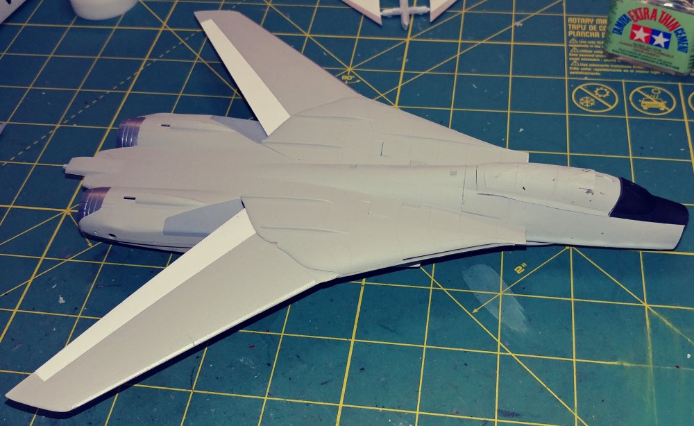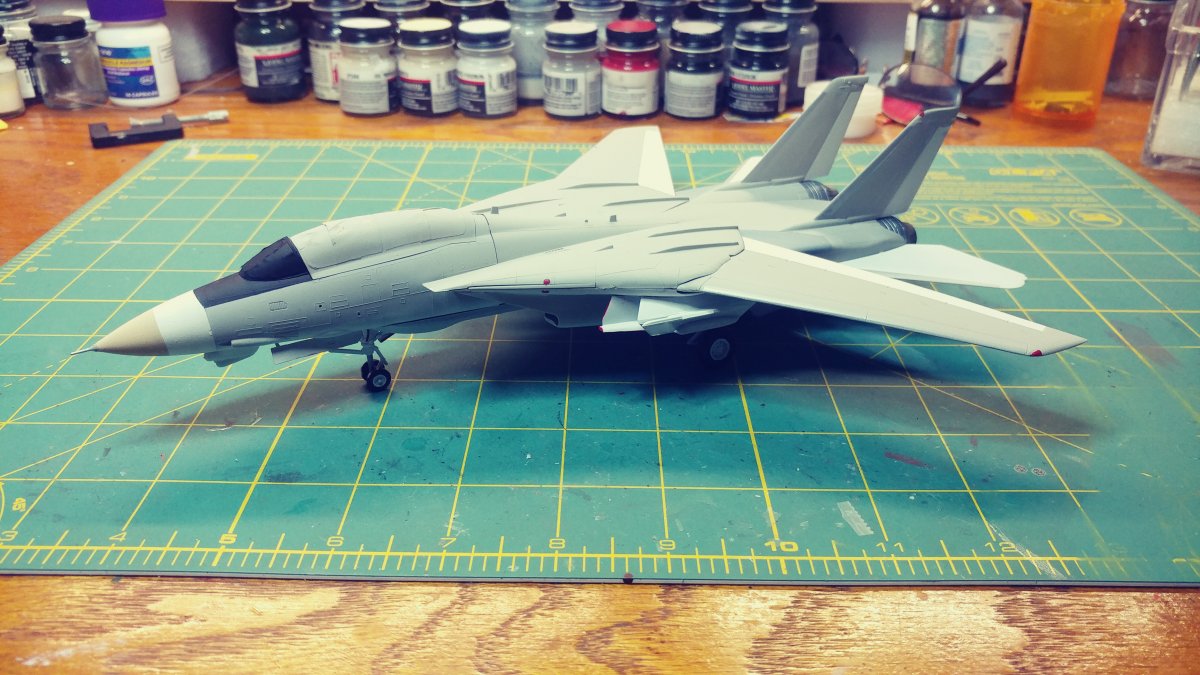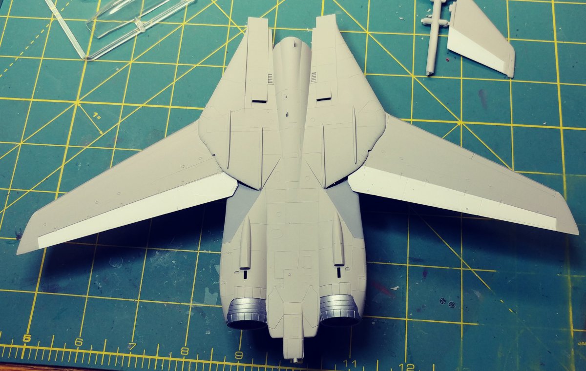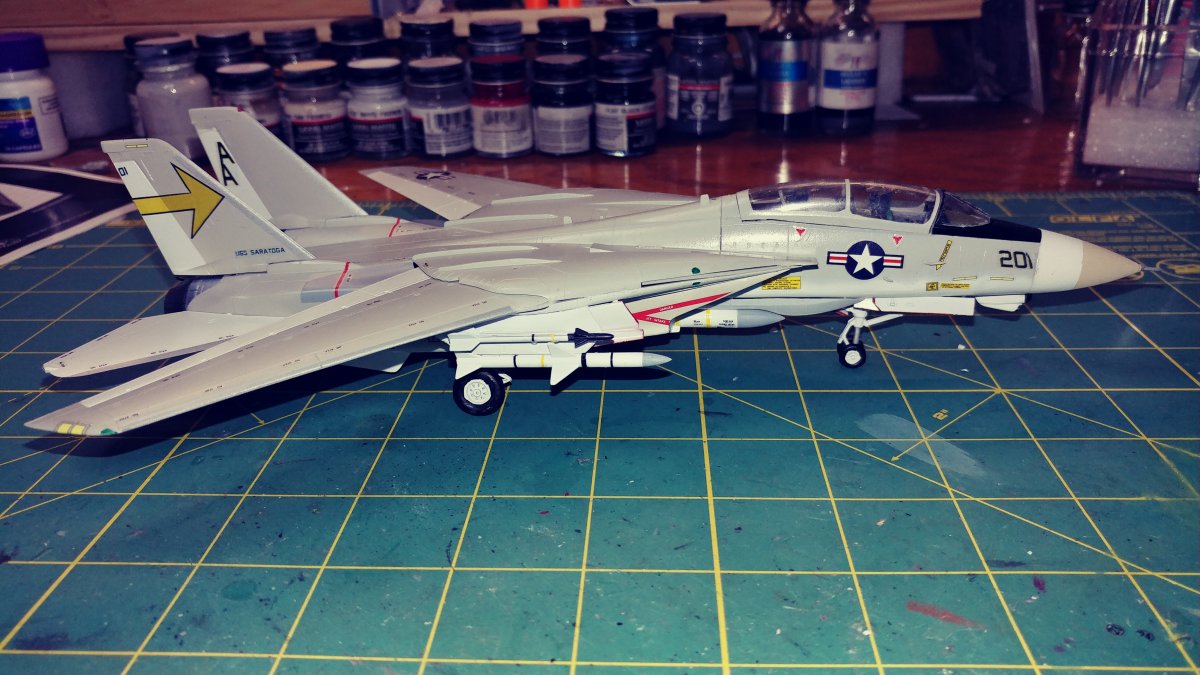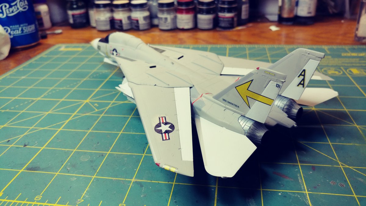 Upon opening the box, you find 6 sprues of gray plastic, a clear sprue with the canopy and decals for 2 aircraft. At first I was surprised to find raised panel lines rather than engraved until I saw the age of the kit and remembered raised panels were the norm for kits of this scale back in the 70's . Wheel well detail was minimal and and cockpit detail was non-existent requiring decals, Again indicative of the age of the kit. There was a small amount of flash on a couple of parts, but aside from that they were very clean. Unlike Hasebawa's 1/48th Tomcat, the wings are adjustable and geared to be sweepable after assembly. The kit comes with two sets of markings, the obligatory Jolly Rogers of VF-84 and the Sundowners of VF-111. The relatively low price of this kit makes it ideal for the younger, less experienced hobbyist looking to move to the next level of difficulty or the Cat fan looking to fill the shelf with multiple squadrons. For the hard core guy, the raised panel lines will probably be a deal breaker. For a More detailed Version, Hasegawa now offers the "F-14A Tomcat Atlantic Fleet Squadrons" with the tthree sets of markings, again, the obligatory Jolly Rogers of VF-84 plus Tomcatters" VF-31 & "Diamond Backs" VD-102 US Navy |