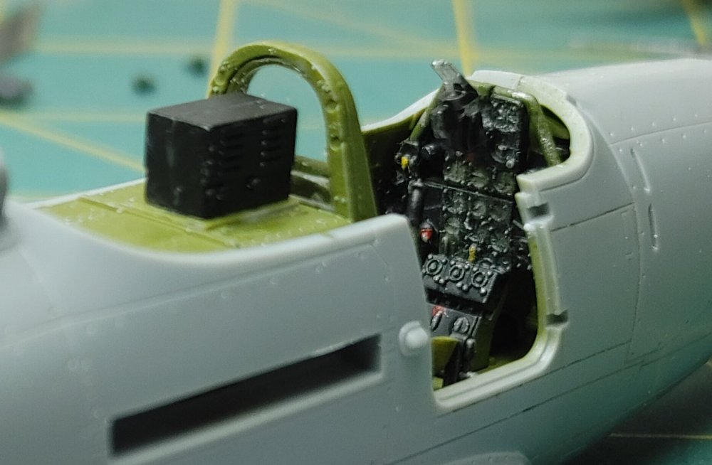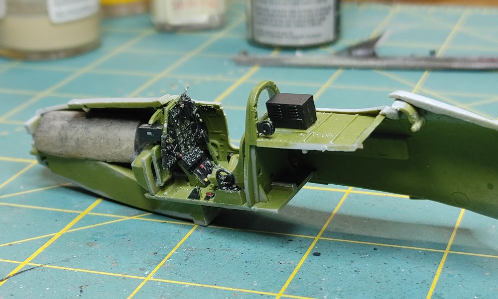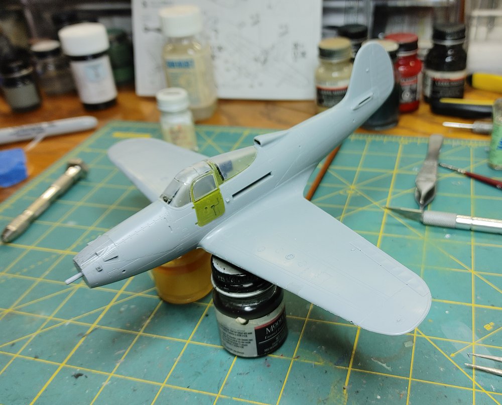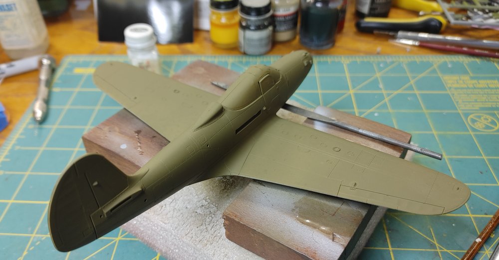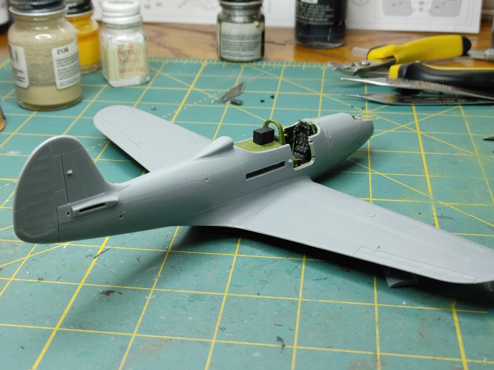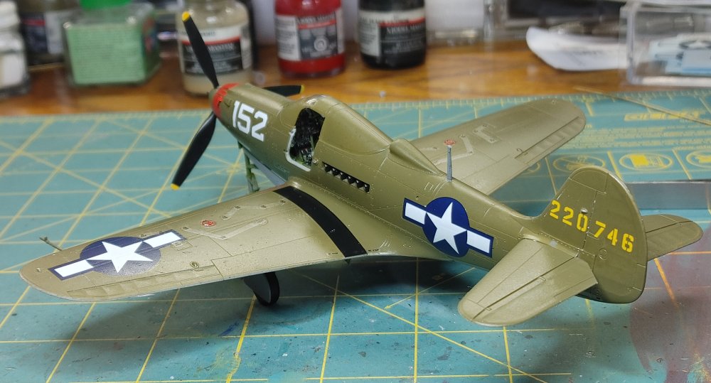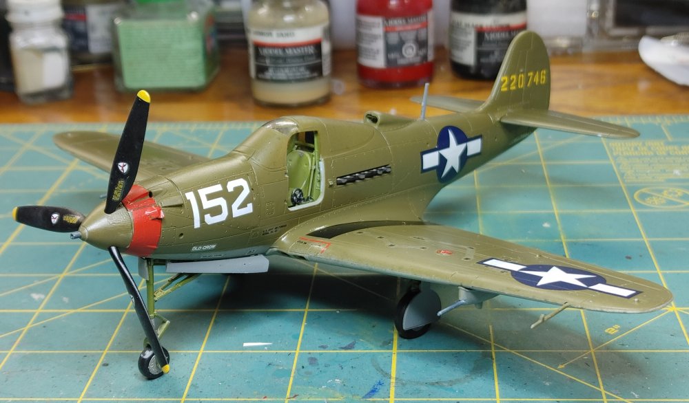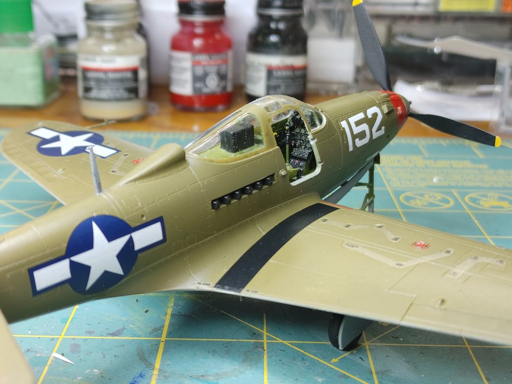 I chose the the -Q version with the underwing .50 cal gun pods The construstion of this kit like most aircraft revolves around the cockpit. Fairly well detailed, the instrument panel has all the gauges, dials and buttons, and it comes with decals if you prefer not to paint and dry brush the details. Once the Cockpit was assembled, it fit into the fusilage and the two halves went together without any issues follows by the wings. Mating the wing to the fusilage usually takes a little effort, but in this kit, there were no gaps or alignment issues I've found with others. Masked off and attached the doors and canopy and off the the spray table. Horizontal stabilizers and gear doors were painted seperately Once dry, the landing gear and tail surfaces were installed, This kit comes with "weighted wheels" meaaning a flat spot that helps keep the kit from rocking back onto it's tail The decals were interesting, for the most part they're a little thick and take a lot of solvaset to settle into the recesses. The stenciling data is in strips covering several locations at a time instead of the usual individual decals. While they're easier to apply, they do leave noticable long strips of film between the markings as you can see in the build photo's that are only a little less noticable after the aircraft is clear coated. Painting...