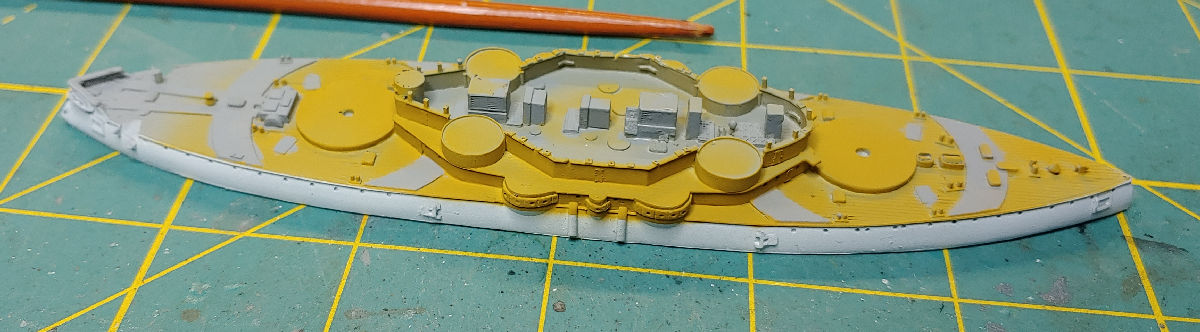There's a little cleanup involved at the waterline but it went pretty smooth. Prior to painting, the Tertiary armament mounts needed to be drilled out requiring a #80 drill. Entire hull was primed light grey prior to the top coat. The buff is too light, but it was the closest I could find. The steel areas on the deck which appear to be muzzle blast areas I painted haze gray.